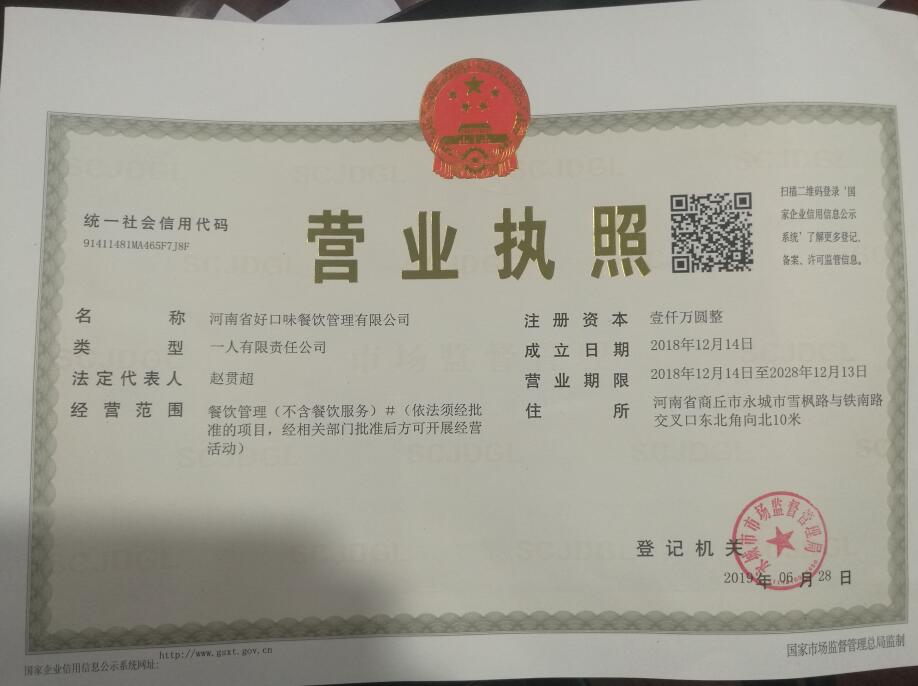 2018年12月14日成立河南省好口味餐飲管理有限公司。